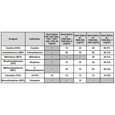 TODA DrugDiag Tükürük testi, yaygın olarak tüketilen beş madde sınıfını tespit etmek için özel olarak geliştirilmiştir. Bunlar arasında 10 ng/ml tespit sınırıyla eroin ve morfin gibi Opiatlar (OPI10), yine 10 ng/ml tespit sınırıyla Kokain (COC10) ve her biri 50 ng/ml tespit sınırıyla Amfetaminler (AMP50) ve MDMA (MET50) dahil Metamfetaminler bulunmaktadır. Birçok kullanıcı için özellikle önemli olan, testin kenevisin ana etken maddesi olan Tetrahidrokanabinolü (THC15) 15 ng/ml tespit sınırıyla tanıma yeteneğidir.